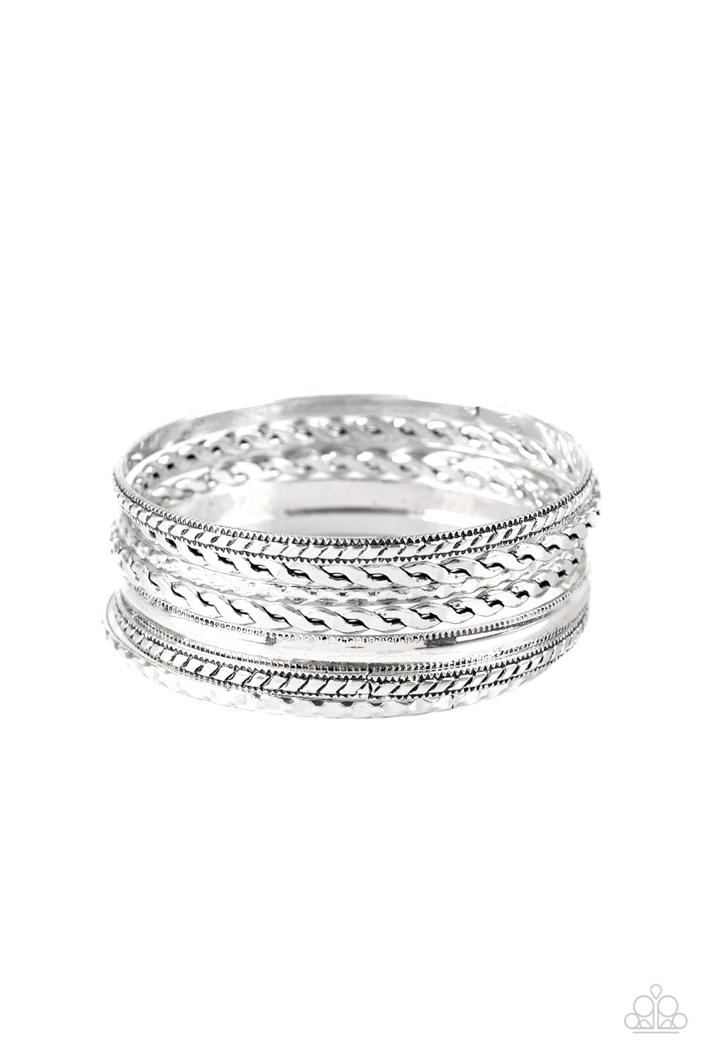 Featuring an array of tribal inspired textures, mismatched silver bangles stack across the wrist for a seasonal look.