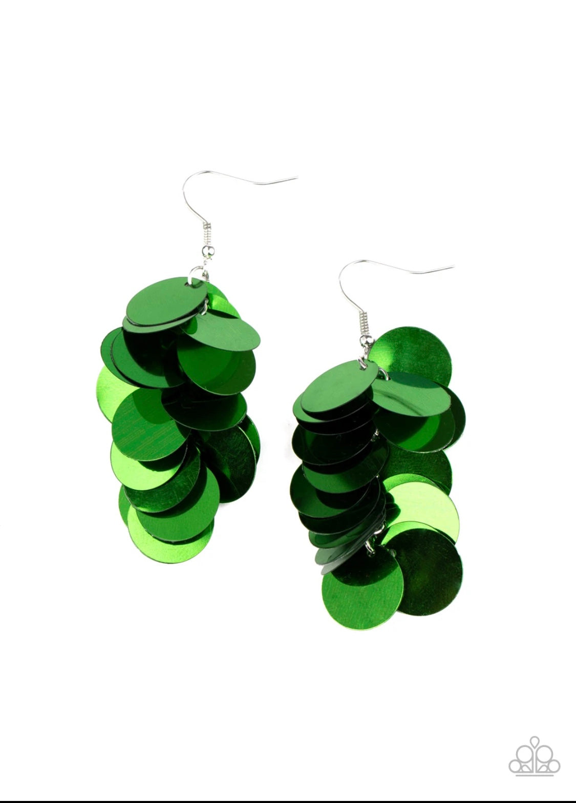A cluster of bubbly metallic green sequins dangle from the ear, creating effortless effervescence. Earring attaches to a standard fishhook fitting.