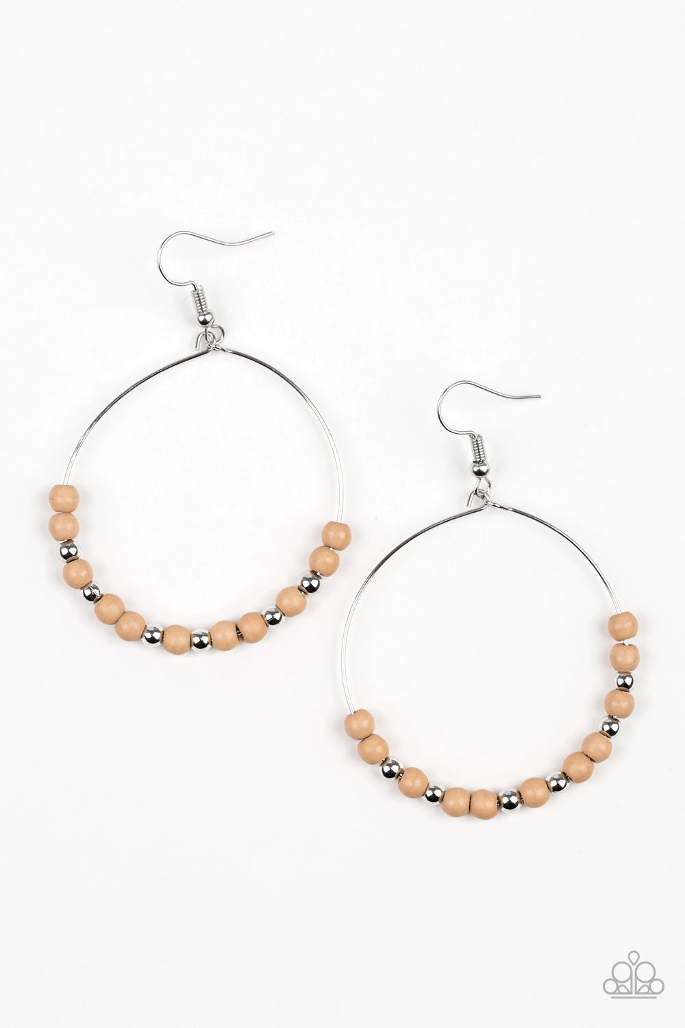Dainty silver beads and earthy brown stone beads slide along a dainty silver hoop for a seasonal look. Earring attaches to a standard fishhook fitting.