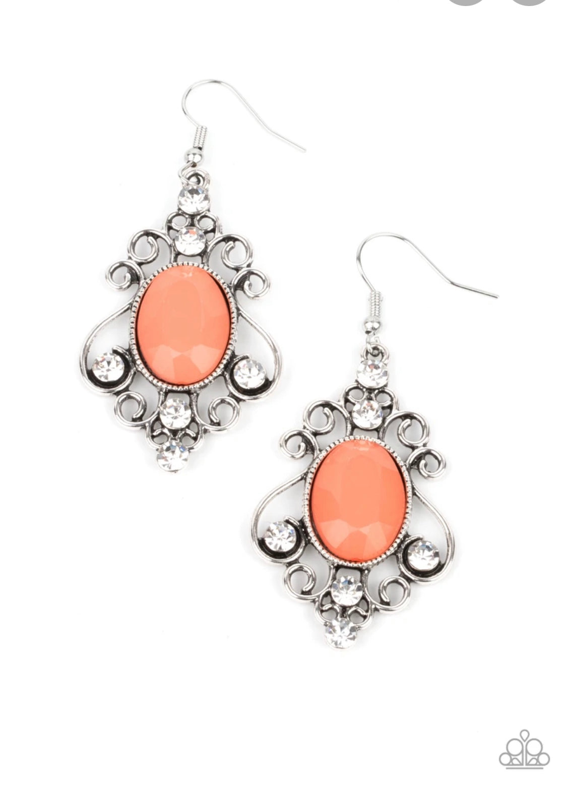 Dotted with glittery white rhinestones, antiqued silver filigree flares out from an opalescent Burnt Coral gem, creating an enchanting chandelier. Earring attaches to a standard fishhook fitting.