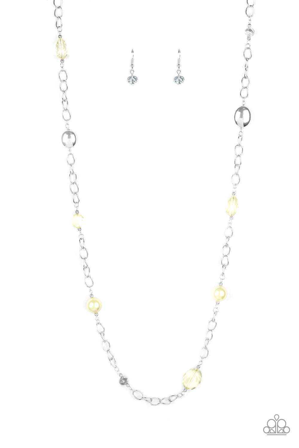 A collection of crystal-like, shiny silver, and pearly yellow beads trickle down a shimmery silver chain for a refined flair. Features an adjustable clasp closure.