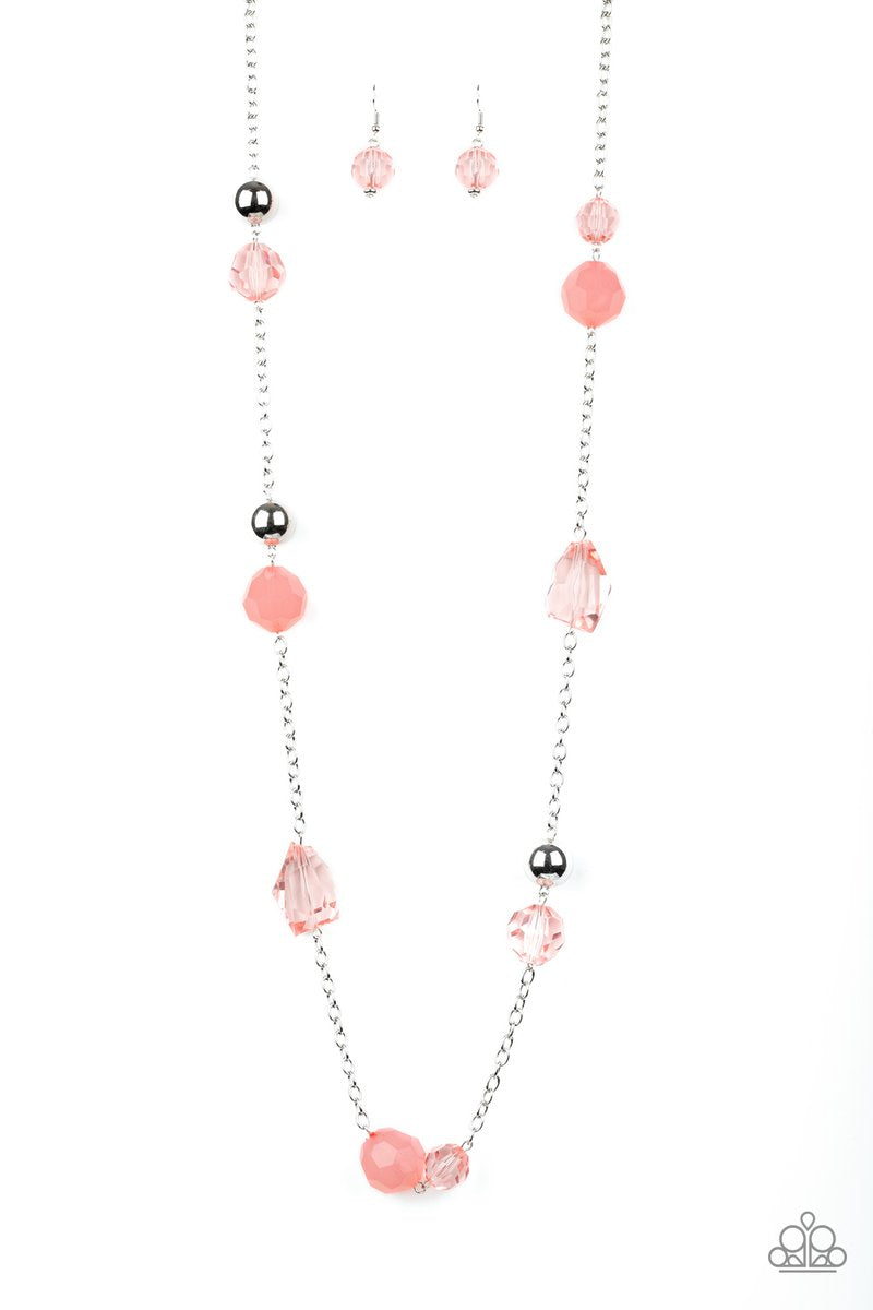 Infused with oversized silver beads, a collection of glassy and opaque orange crystal-like beads trickle along a shimmery silver chain for a whimsical look. Features an adjustable clasp closure.