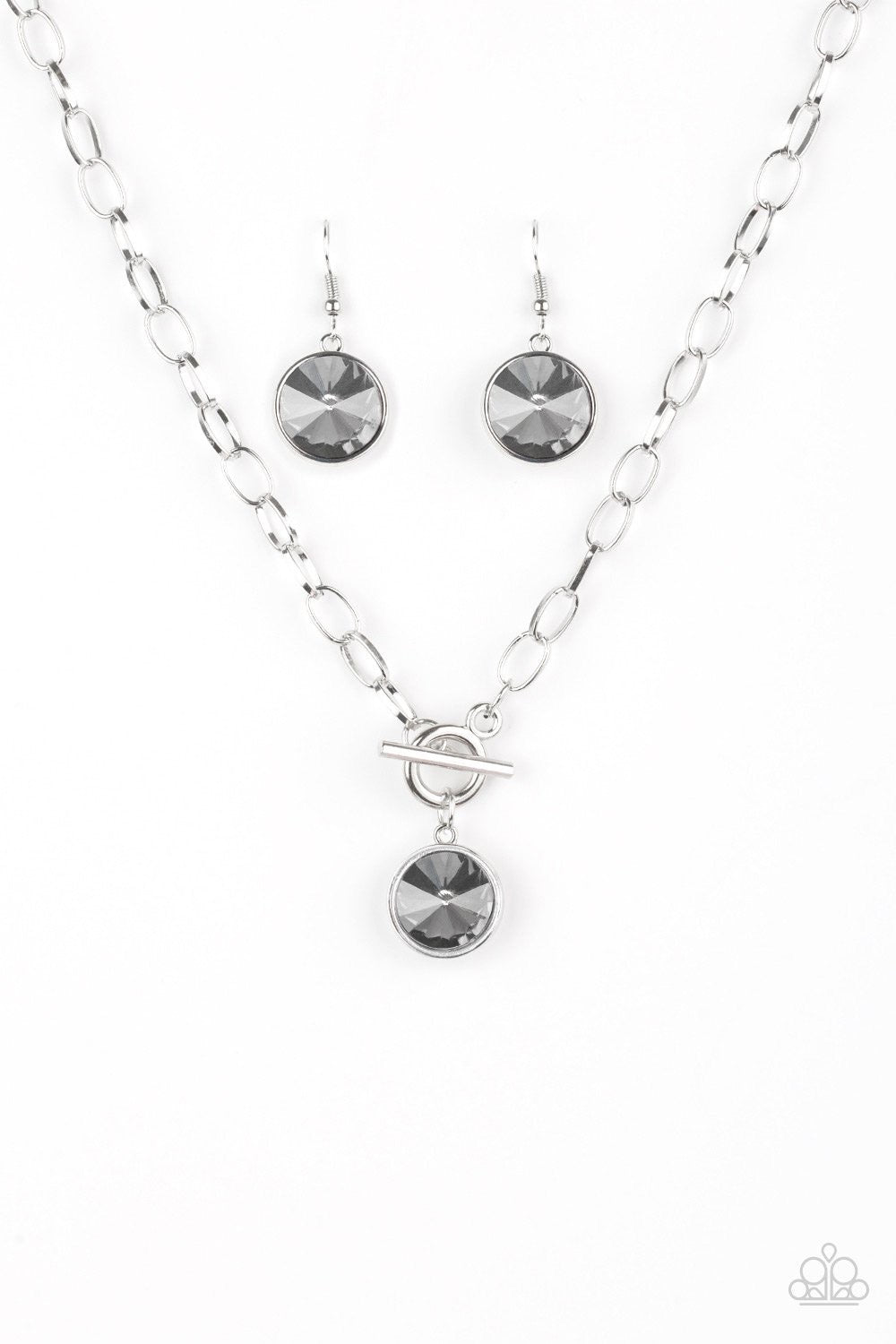 A dramatic smoky gem swings from the bottom of a shiny silver chain, creating a blinding pendant below the collar. Features a toggle closure.