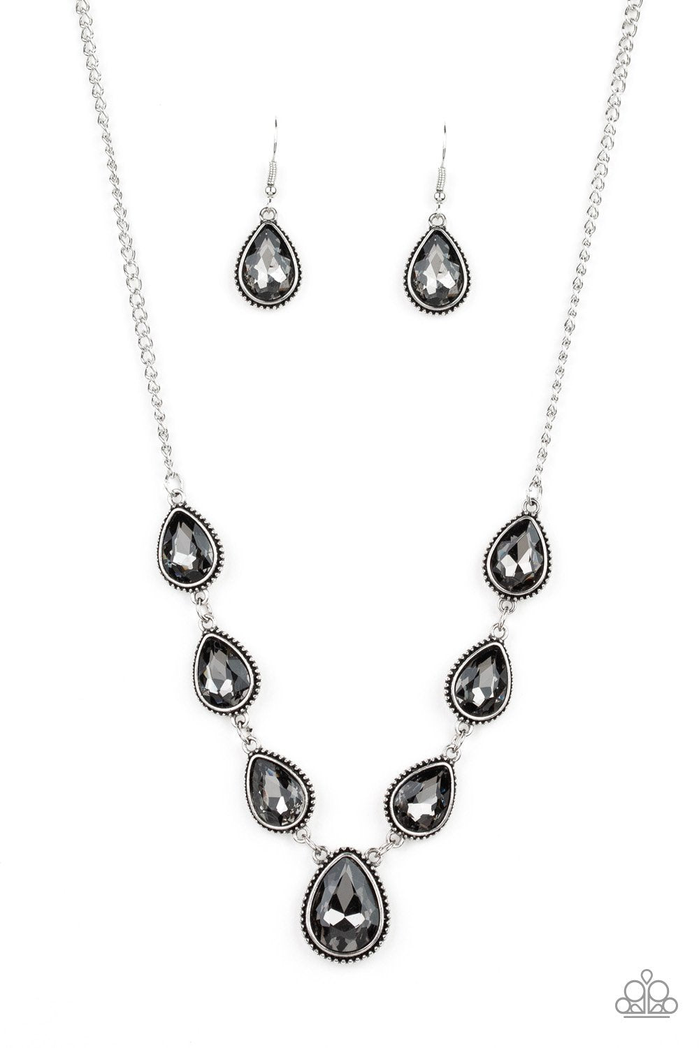 Featuring ornate silver frames, smoky teardrop gems link below the collar in a timeless fashion. The largest teardrop swings from the center, creating a glamorous pendant. Features an adjustable clasp closure.