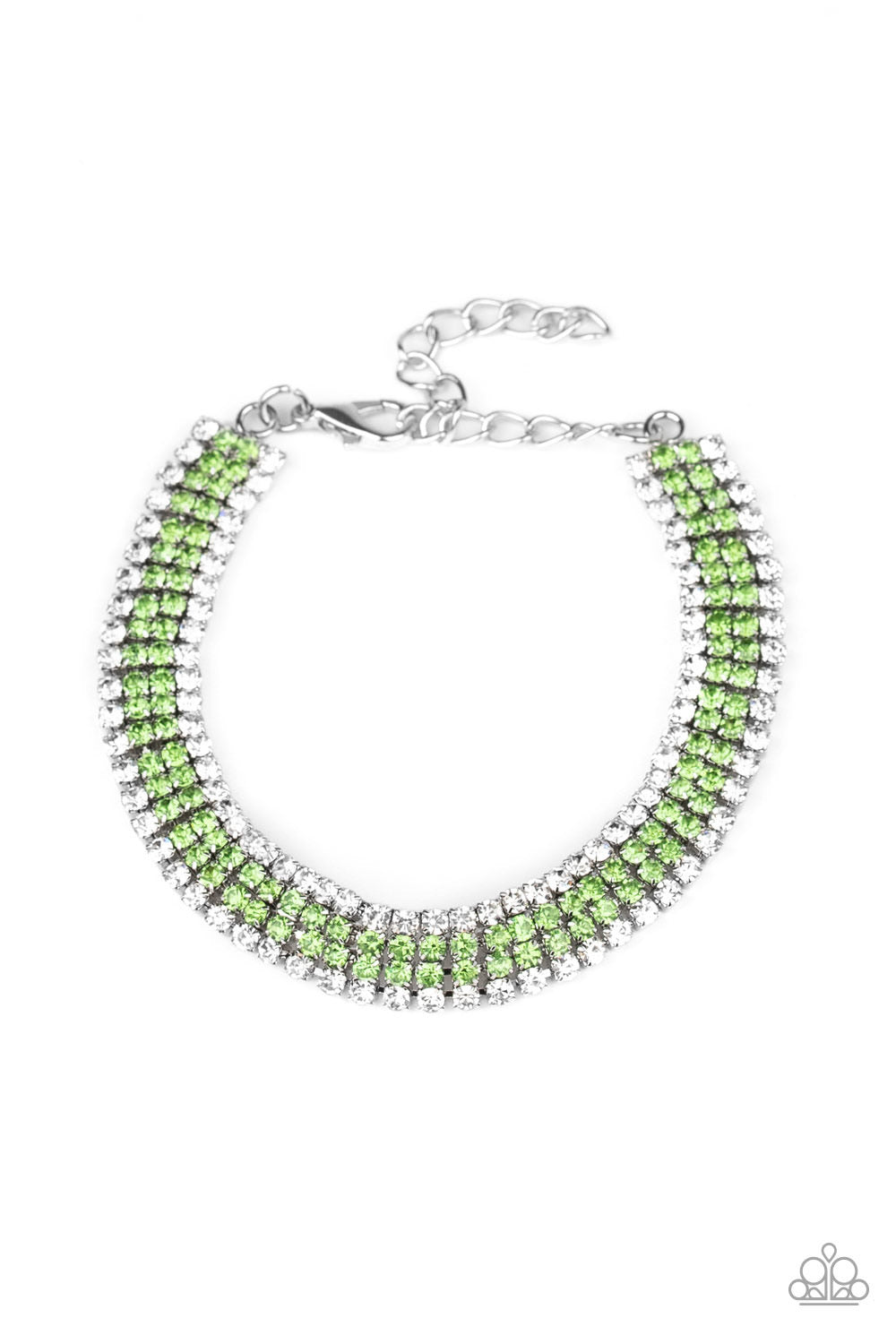 Flanked by strands of glassy white rhinestones, two rows of glittery green rhinestones layer across the wrist, coalescing into a single strand of glitz. Features an adjustable clasp closure.