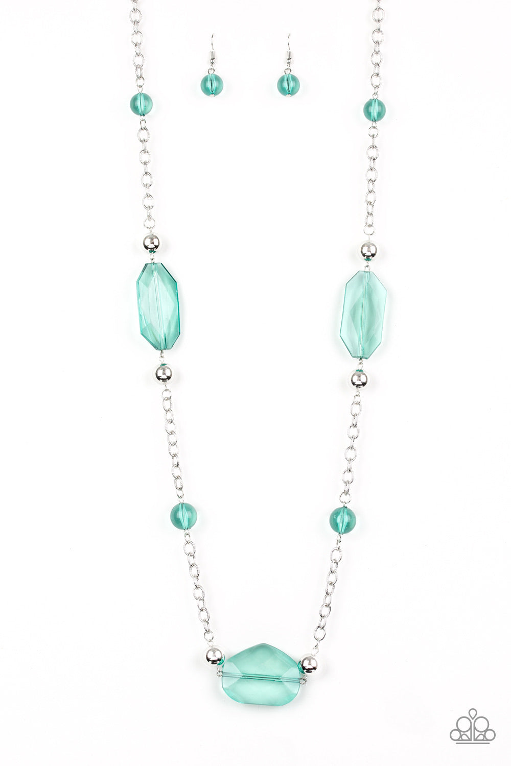 A collection of glassy green beads, shiny silver beads, and oversized faceted crystal-like beads trickle along a shimmery silver chain across the chest for a whimsically refined look. Features an adjustable clasp closure.